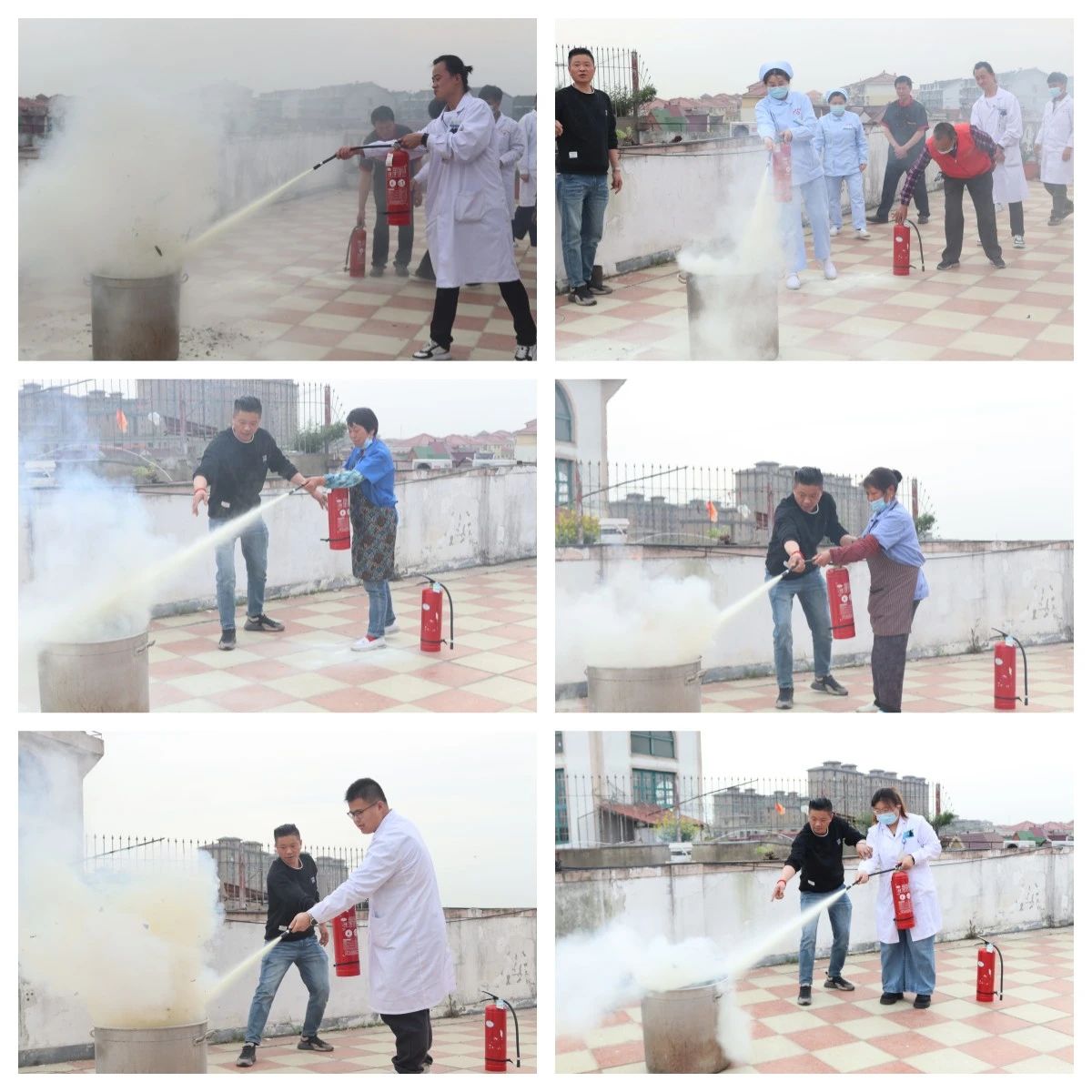 理论培训结束后,随即开展了灭火器的使用实操演练,由郑秋新主任在一旁知道,每个人都对灭火器进行实操,要求必须做到人人会使用。
