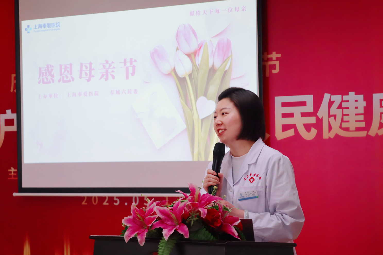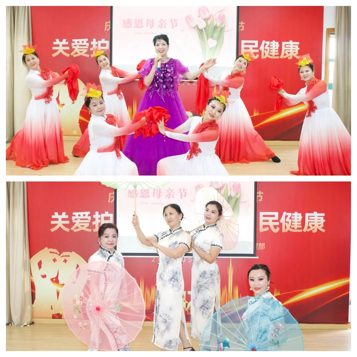 下午13:30,医院四楼会议厅化身为爱的舞台,由办公室白主任主持的"感恩母爱・医心同行"文艺演出正式拉开帷幕。陶院长与奉城六居委张书记先后上台致辞,共同向天下母亲致以节日问候:"母亲是生命的守护者,今天我们以艺术为媒,致敬每一位平凡而伟大的母亲。