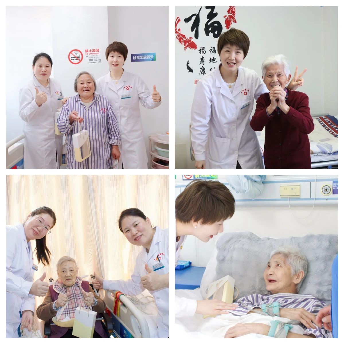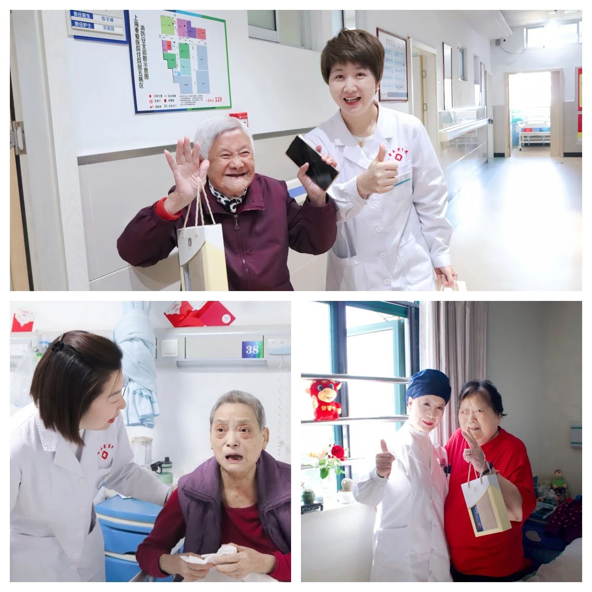面对这份突如其来的关怀,女患者们的反应令人动容:有的阿姨接过礼物时眼眶泛红,轻声说"孩子们都忙,没想到医院比家人还贴心";有的大姐开心得像孩子一样手舞足蹈,拉着护士的手说"这是我住院以来最开心的一天";更有患者紧紧握住陶院长的手连连说着:"谢谢,谢谢你们。"