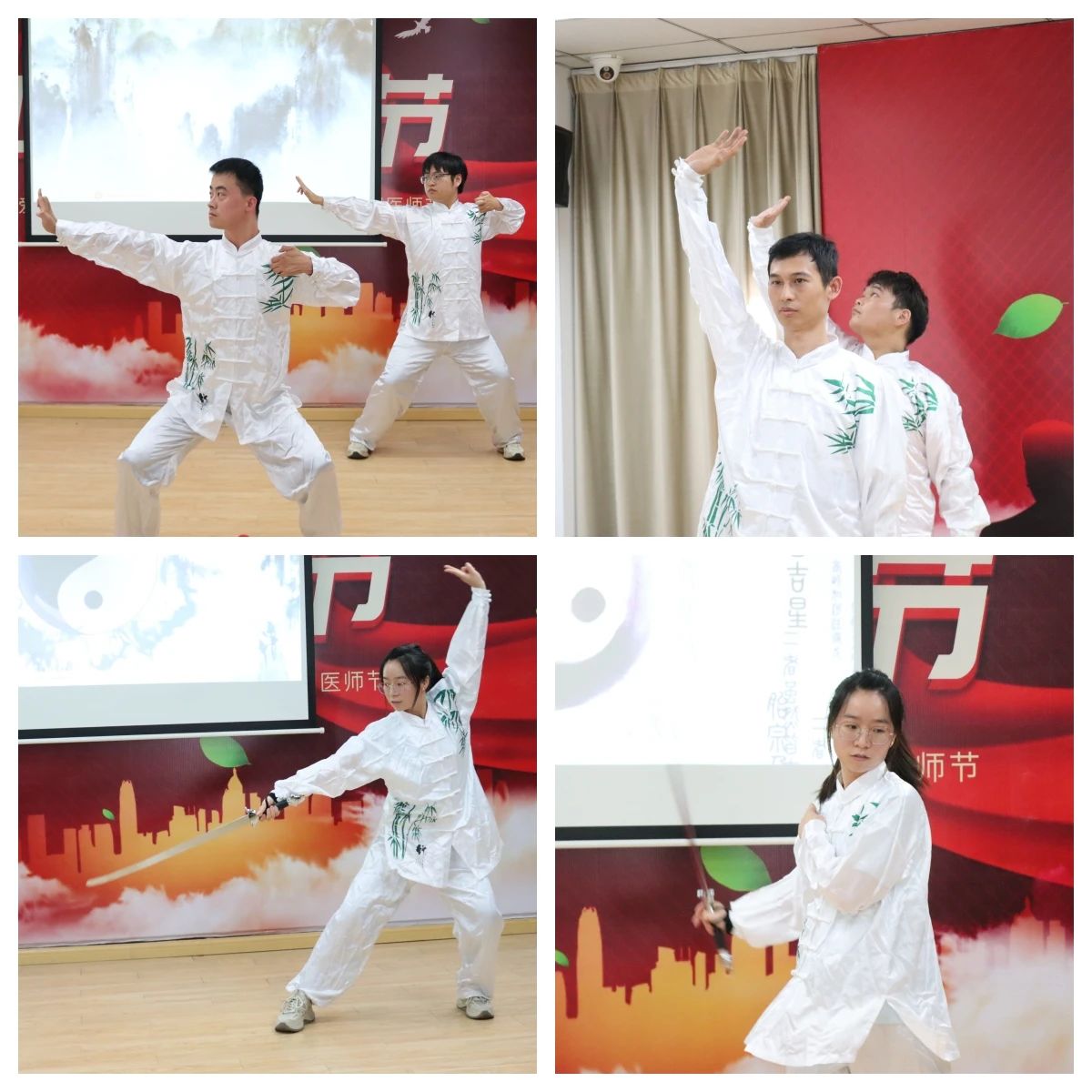 当悠扬的古乐响起,中医科团队身着素色服饰登场,《八段锦》的一招一式舒展流畅。“两手托天理三焦” 的轻盈、“左右开弓似射雕” 的沉稳,将传统养生文化与医者“治未病”的理念巧妙融合,赢得满堂喝彩。紧接着中医科舒敏医生持剑登场,素衣挺拔,沉静专注。云剑轻旋如流风,劈剑沉身似劲松,点剑轻挑若银针。一招一式刚柔相济,剑随心动,恰合中医“阴阳调和” 之意。收势时剑归鞘,余韵悠长。
